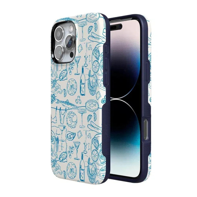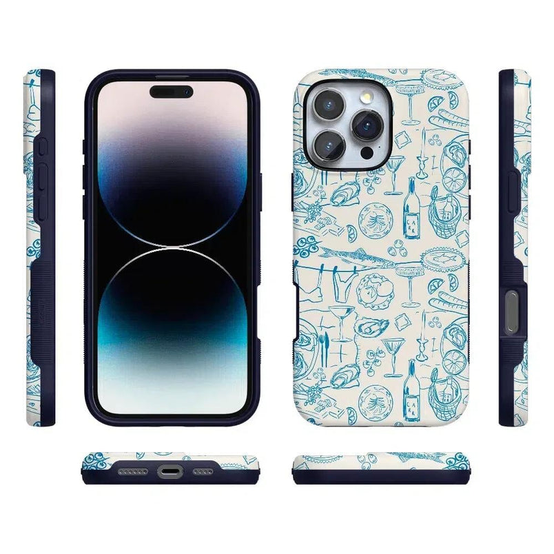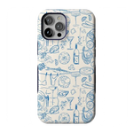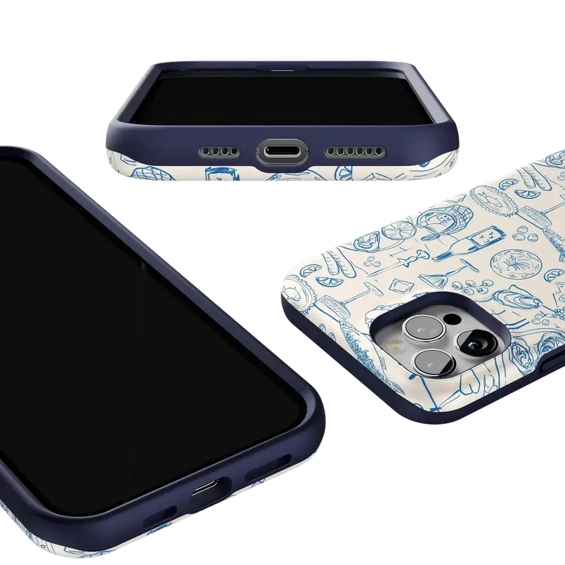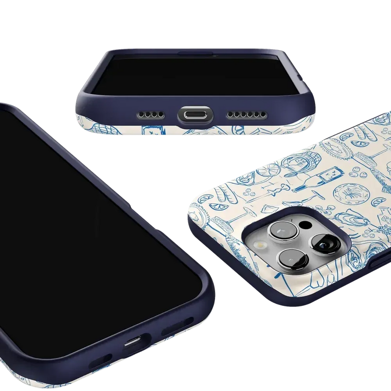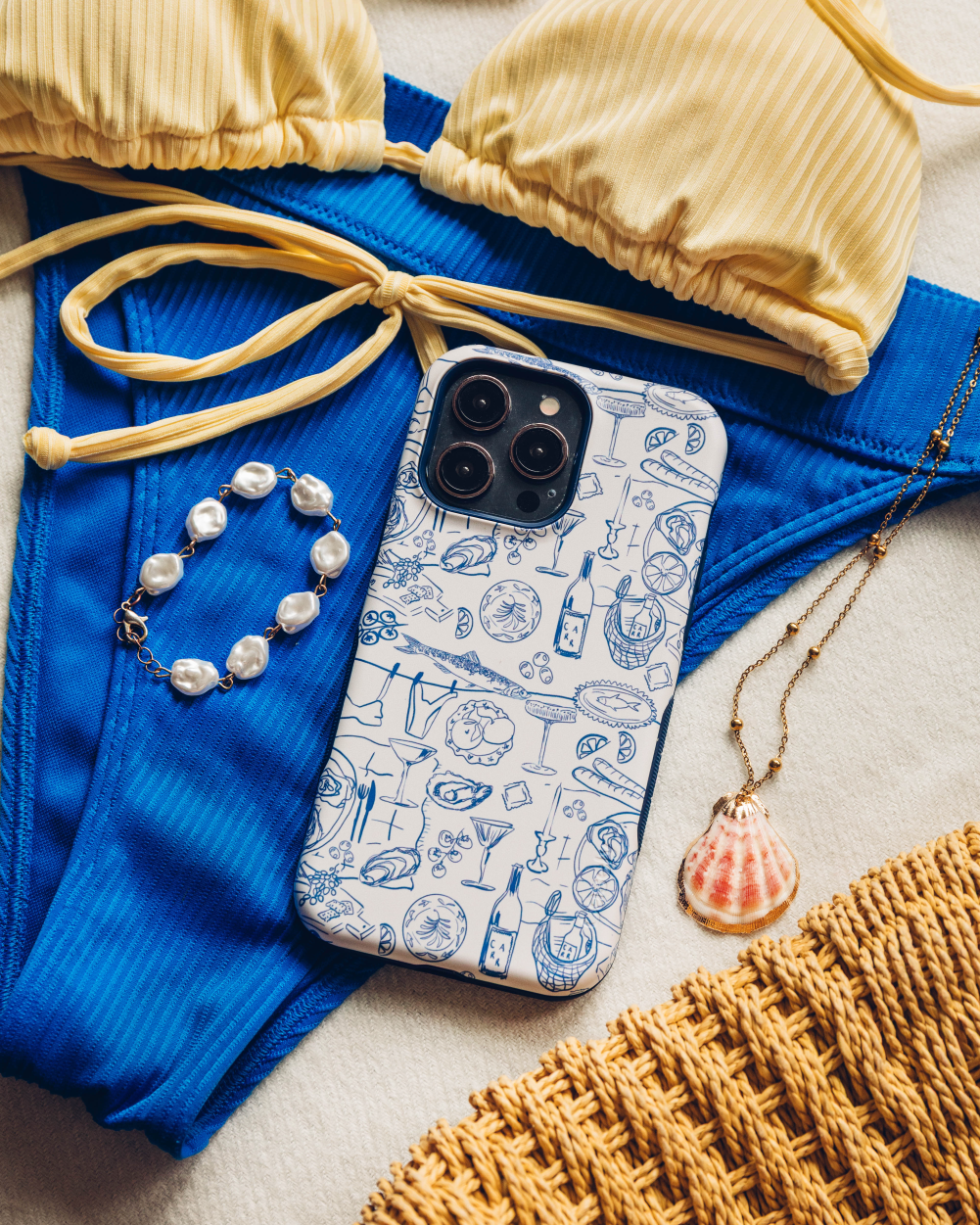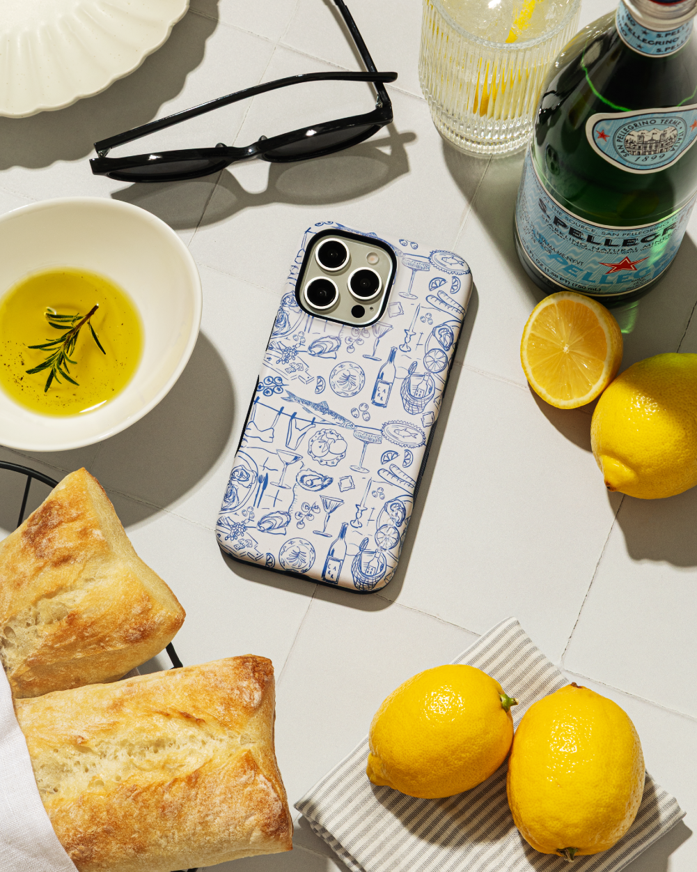 Say ciao to coastal charm with the Amalfi Aperitivo | Dolce Vita Case. Inspired by long lunches and golden hour cocktails on the Italian Riviera, this playful sketch-style design features aperitivo icons like spritzes, olives, pasta, and gelato—all set against a soft ivory backdrop with deep blue detailing. It’s your personal slice of seaside leisure, now in phone case form.