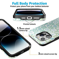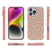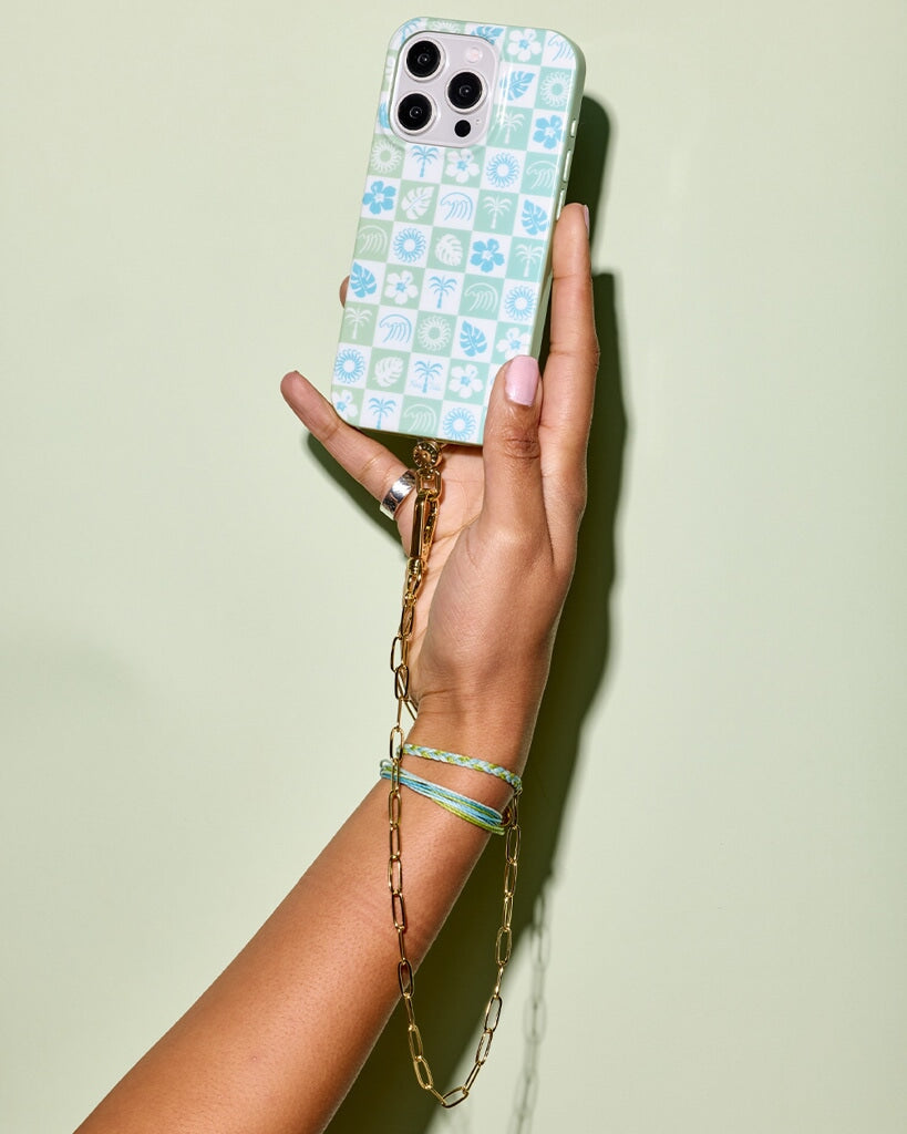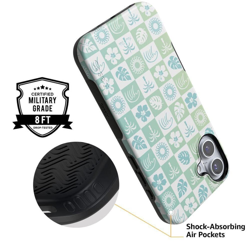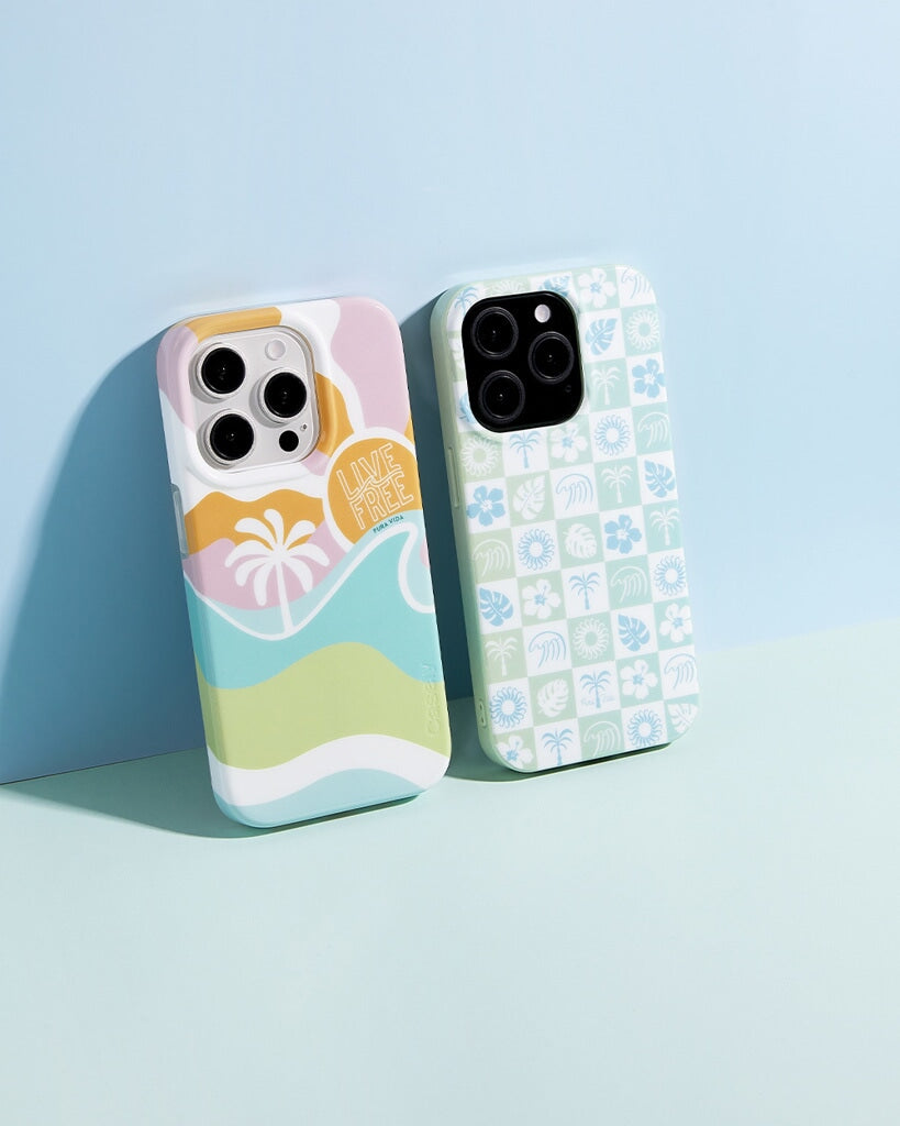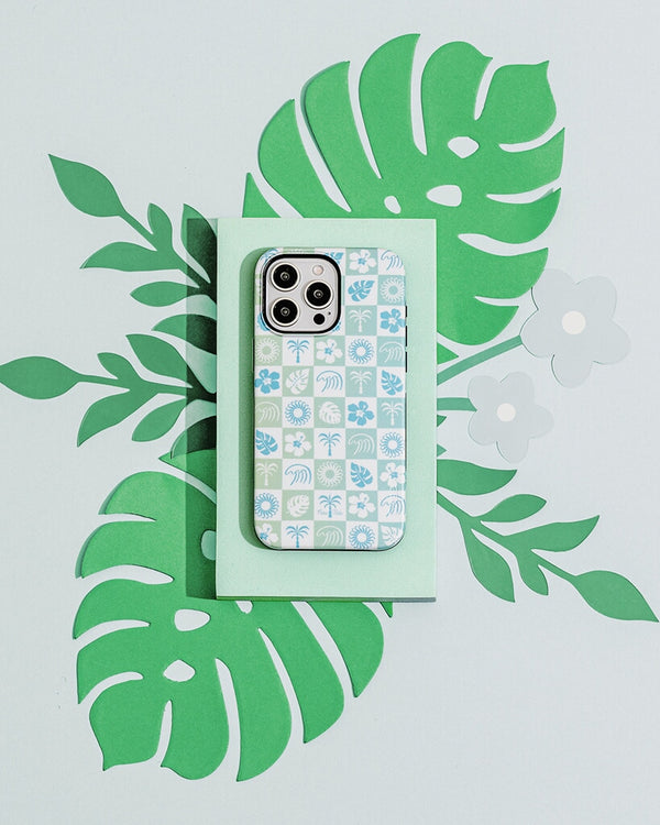 Bring the beach vibes with you wherever you go with the Coastal Checkers phone case, part of our exclusive Pura Vida x Casely collab! Featuring a refreshing mix of seafoam green and ocean blue in a playful checkerboard pattern, this design is a must-have for anyone who loves laid-back, coastal style. Adorned with tropical icons like palm trees, hibiscus flowers, and seashells, this case is the perfect accessory for your next adventure.