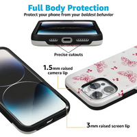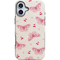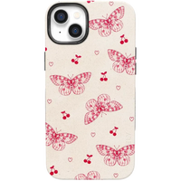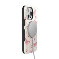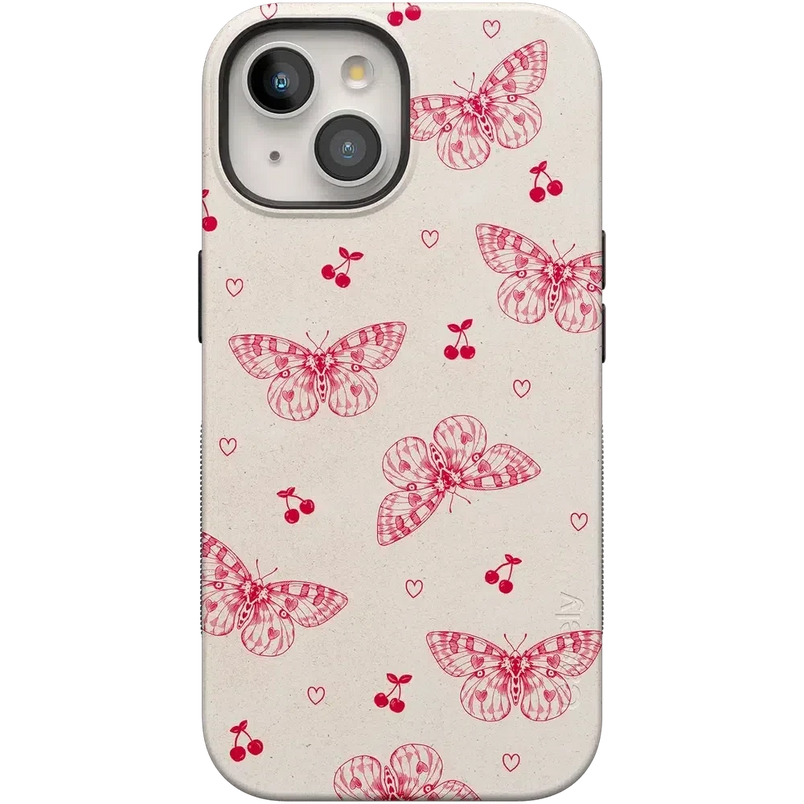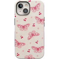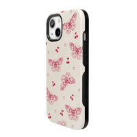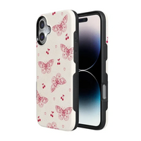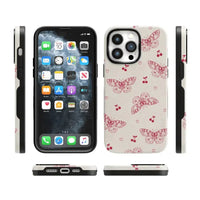 Let your phone take flight with the Heart Flutters | Butterfly Case. Featuring intricate red butterflies, charming cherry accents, and sweet little hearts on a soft neutral background, this case is perfect for anyone who loves a romantic and playful vibe.