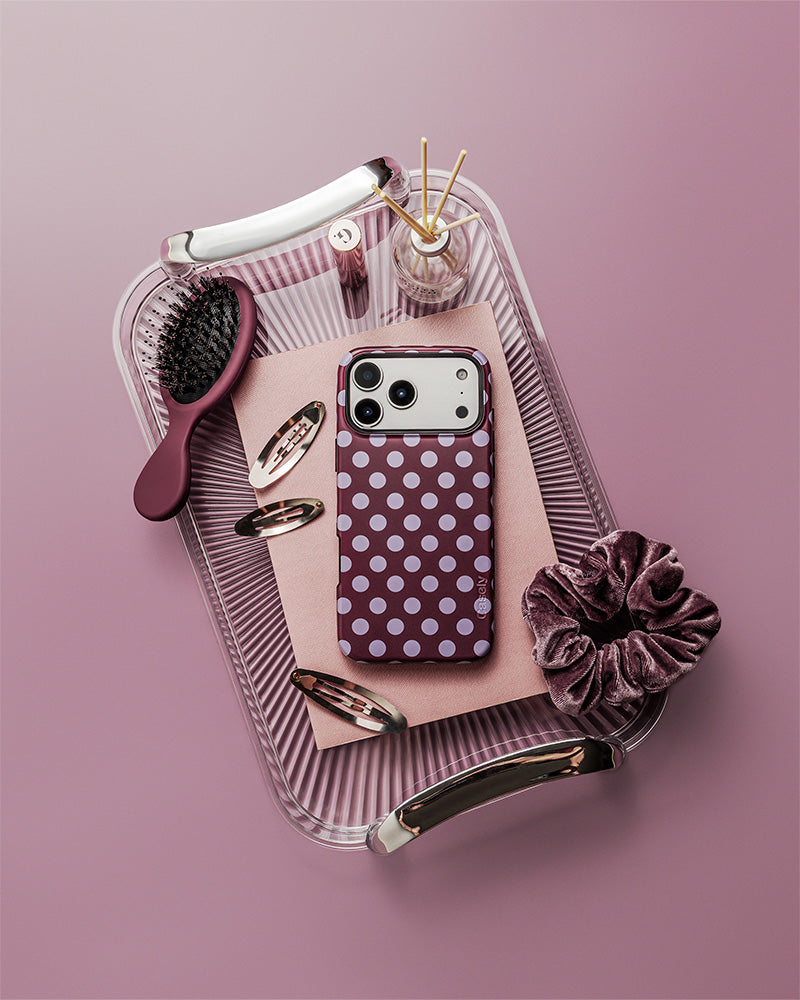 A classic polka dot with a downtown feel. The Spotted in SoHo Polka Dot Case features evenly spaced lavender dots set against a rich chocolate brown background, creating a playful contrast that still feels polished and wearable. The scale of the dots keeps the pattern bold without being overwhelming.