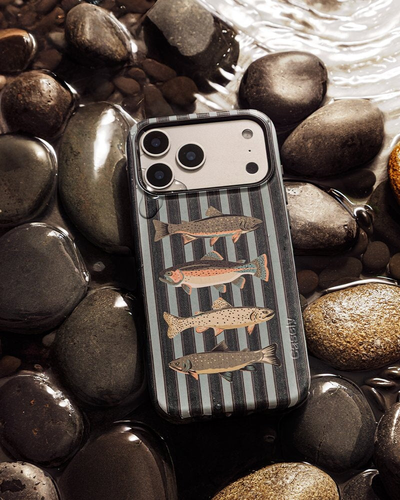 Best Catch blends vintage fish illustrations with muted green vertical stripes for a design that feels collected, not trendy. Outdoors-inspired but city-ready, it strikes the balance between classic and unexpected. Part of The Boyfriend Collection, this unisex striped phone case draws from maritime graphics and heritage patterns while keeping the look refined and modern. Designed for everyday durability, it features impact-absorbing protection and raised edges to help protect your screen and camera. Available for iPhone, Samsung, and Google Pixel in our Bold, Classic, and Align case types, including MagSafe-compatible options. A striped phone case with personality — without leaning loud.