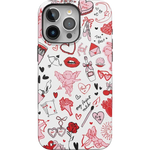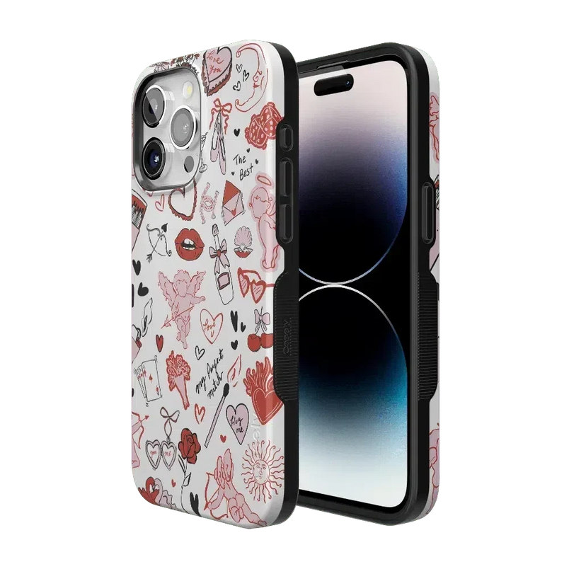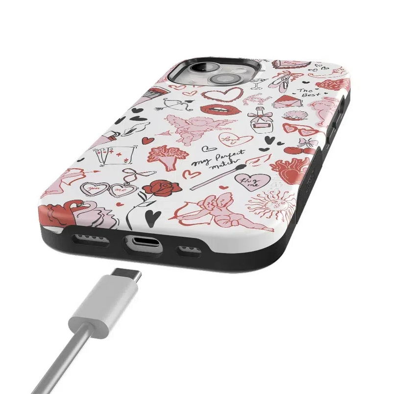 Fall in love with the Cupid's Touch | Collage Case, a must-have for Valentine’s Day. Featuring a playful mix of love-inspired doodles—cherubs, roses, hearts, lips, and sweet phrases—this design radiates charm and romance. The vibrant red, pink, and black accents on a crisp white background make it the perfect accessory for adding a touch of love to your everyday style.