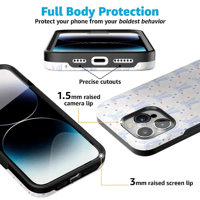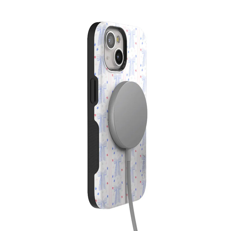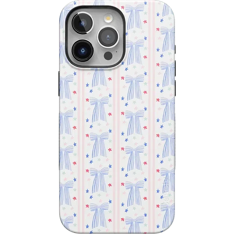 Feel the patriotic charm with the delightful pattern of blue bows and scattered pastel stars! Casely’s Summer Bows Coquette Case captures the spirit of summer with a charming combination of colors like blue, pink, and red. Featuring 360° wrap protection, a slim profile, a 2mm raised lip for screen and camera protection, and a built-in MagSafe compatible magnet, this case ensures both style and robust protection for all your adventures.