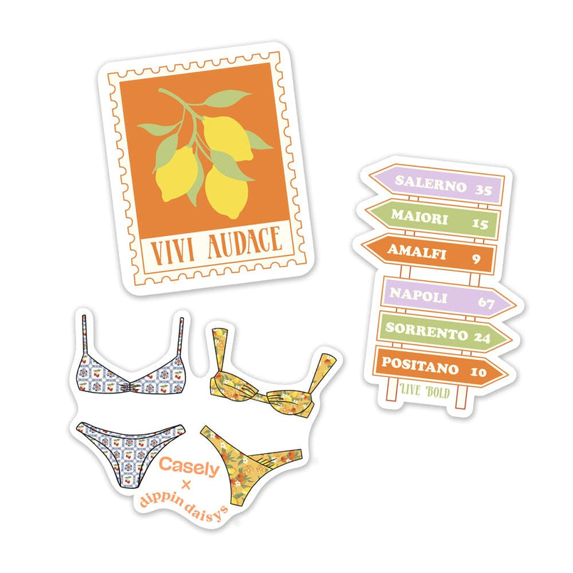 This sticker pack includes: 1 lemon stamp sticker 1 Italian road sign sticker 1 Dippin' Daisy's swimsuits sticker All stickers are reusable, easily removable & dishwasher safe! Made of durable vinyl with a laminate cover, each sticker is made to stand up to indoor and... Read more