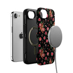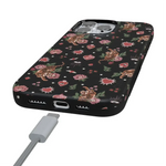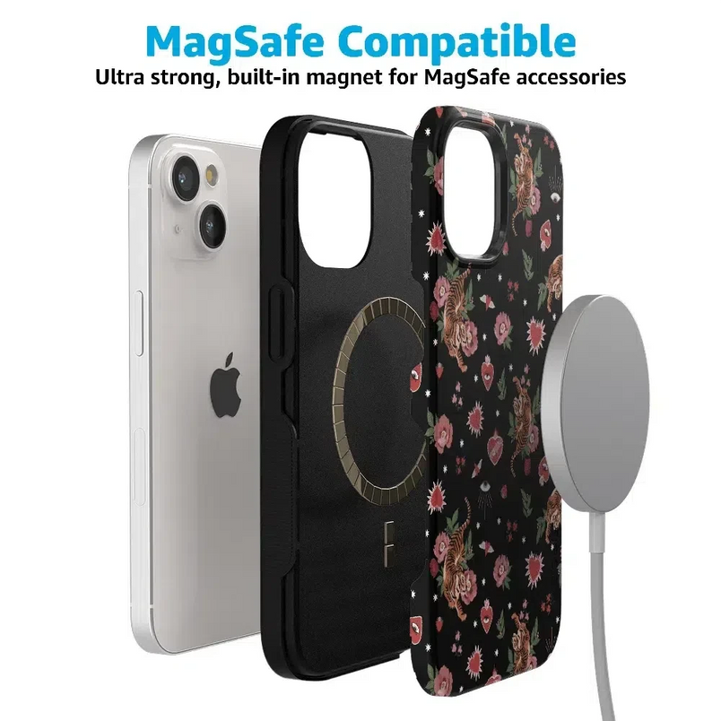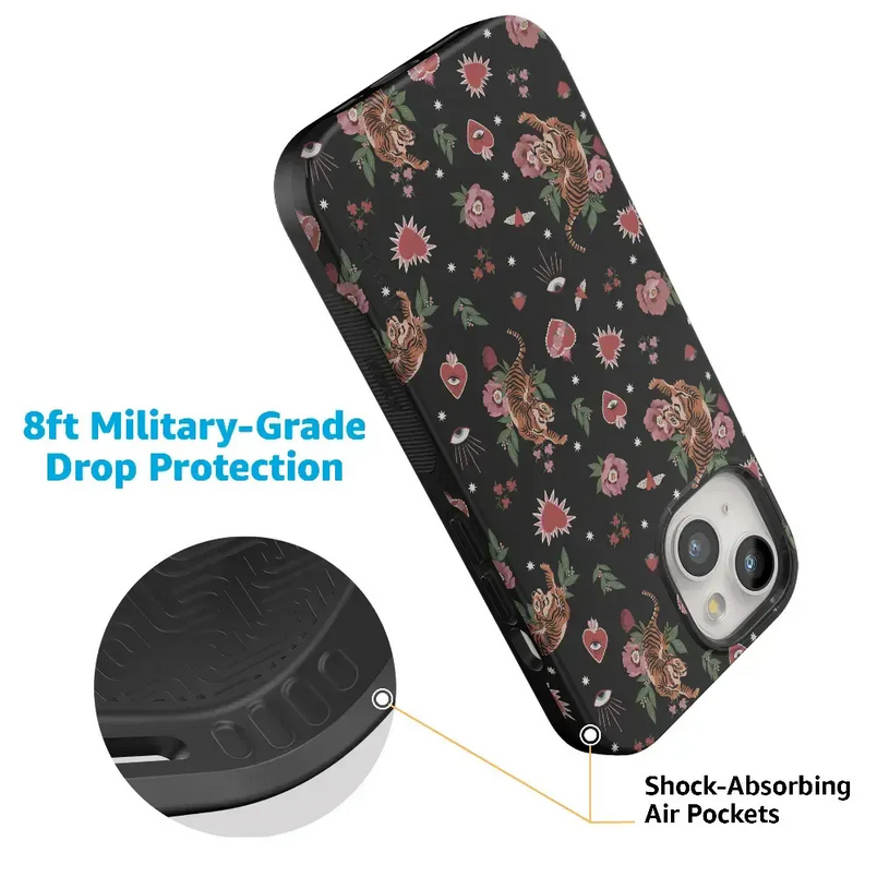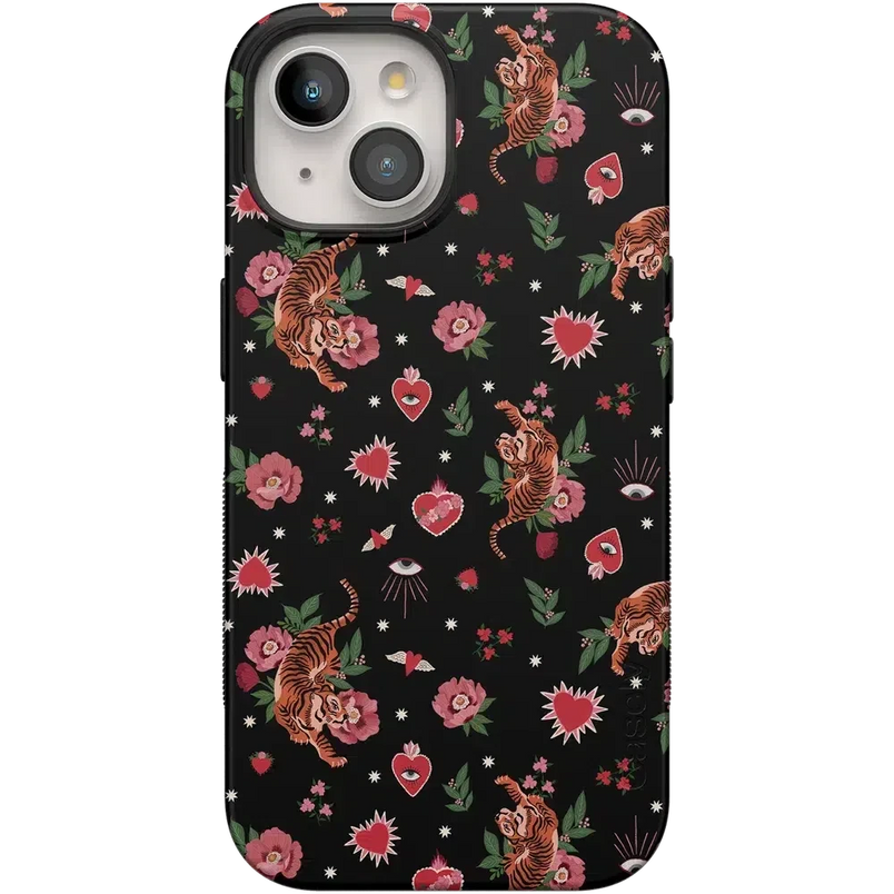 Unleash your bold side with the Wild at Heart | Tiger Case. This fierce design features vibrant tigers surrounded by romantic florals, hearts, and cosmic details on a sleek black background. Perfect for making a statement while embracing your wild and playful side.